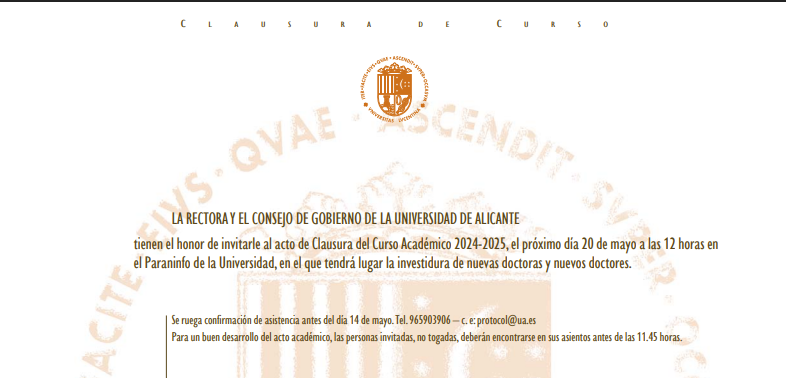 Fecha 20 May 2025 ¡Caducado! Hora 12:00 - 14:00 Acto de Clausura del Curso Académico de la Universidad de Alicante Compartir este evento + Añadir Google Calendar + exportación iCal / Outlook El evento está terminado.