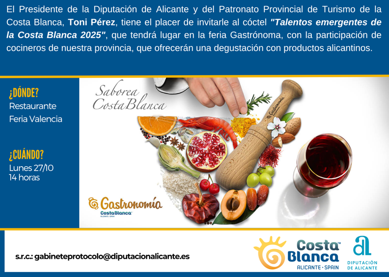 Fecha 27 Oct 2025 ¡Caducado! Hora 14:00 - 16:00 Cóctel “Talentos emergentes de la Costa Blanca 2025” Feria Gastrónoma Compartir este evento + Añadir Google Calendar + exportación iCal / Outlook El evento está terminado.
